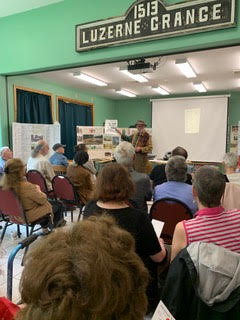 Historical Society program ofDude Ranches … a moment in timepacked the freshly painted Rockwell Falls Public Library on Saturday. Fifty-one people attended to view Mike Griffin’s collection of all things Dude Ranches. Erin Tobin, Executive Director at AARCH spoke about architectural projects and workings to preserve buildings and bridges, while Mike shared his preservation style of collecting artifacts in a humorist presentation.